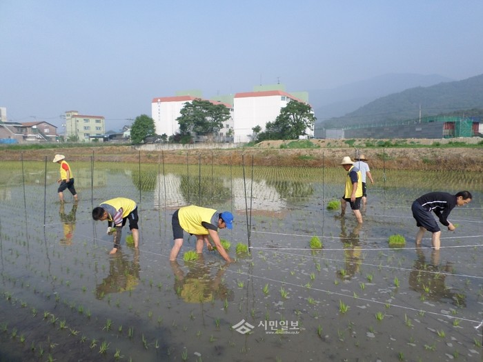경기 포천시 선단동 주민자치위원회는 29일 오전 8시부터 선단초등학교 인근 논에서 '2014년 행복마을 만들기' 사업의 일환으로 주민자치위원 및 선단동장 등 20여명이 참여한 가운데 유색벼를 이용해 논 위에 '주민자치'라는 글씨를 쓰는 등의 모내기 작업을 실시했다. (사진제공=포천시청)