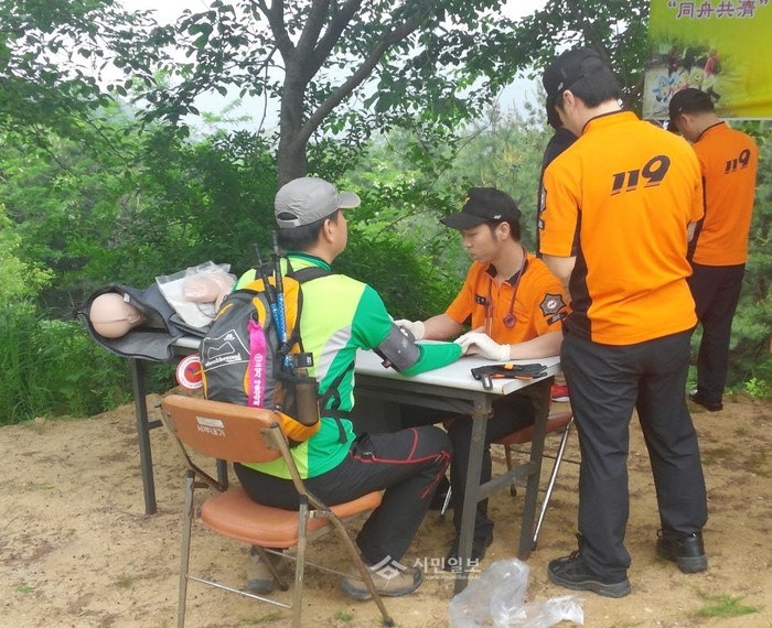 최근 인천 강화소방서 내가119안전센터는 등산객들에게 산악 안전사고에 대한 위험성을 인식시키고 경각심을 높이기 위해 고려산 등산로 일대에서 안전사고 예방수칙이 담긴 홍보물 배포, 등산객 혈압체크, 심폐소생술 시연 등의 응급처치교육을 실시했다. 사진은 등산객에게 심폐소생술을 시연중인 119 대원의 모습.