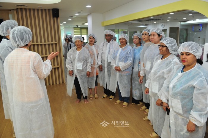최근 서울 송파구 송파 산모건강 증진센터에 한국의 모자보건 증진정책을 벤치마킹하기 위해 방글라데시·미얀마·네팔의 공무원 21명이 방문해 시설견학과 정책관련 교육을 받았다. 사진은 이날 위생복을 입고 주요시설을 둘러보며 설명을 듣는 공무원들의 모습. (사진제공=송파구청)