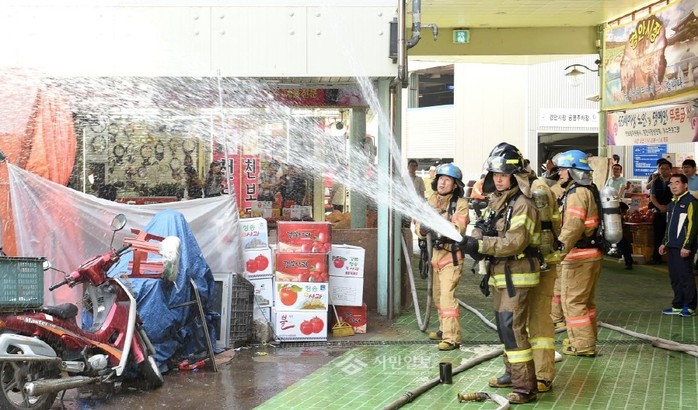 경기 광주시는 지난 5월29일 경인시장에서 경기도청과 광주시청 관계자를 비롯해 광주소방서, 한국전기안전공사, 한국가스안전공사, 경안시장상인회, 의용소방대 등 100여명이 참여하고 소방차 및 구급차량 7대가 동원된 '화재발생 모의훈련'을 실시했다. (사진제공=광주시청)