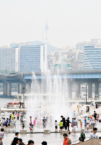 전국 대부분 지방이 낮기온이 30도를 웃돌아 때이른 여름더위가 이어지고 있는 1일 서울 여의도 한강시민공원 물빛광장에서 시민들이 물놀이를 하며 즐거운 시간을 보내고 있다.