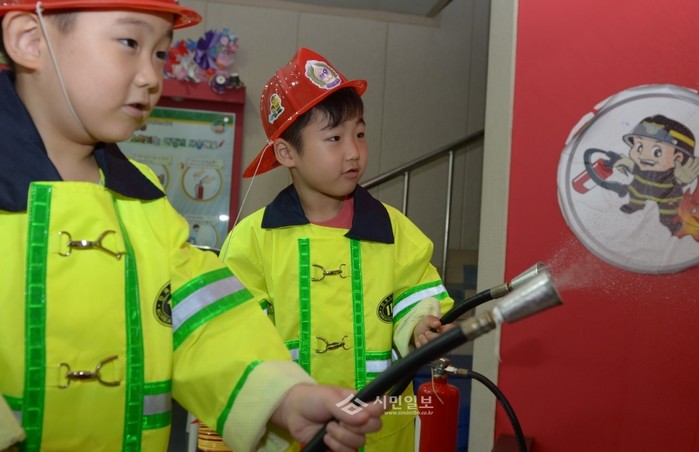 서울 영등포소방서는 지난 5월30일 오전 소방서 4층 안전체험교육관에서 키드어린이집 원생 15명을 대상으로 어린이 소방안전교육을 실시했다. 이날 교육은 소화기사용법, 물소화기 시뮬레이션 체험, 119 화재신고요령, 비상구 찾는 방법, 화재발생시 연기 대피요령, 소방차량 견학 등 다채로운 소방체험을 실시했다. (사진제공=영등포소방서)