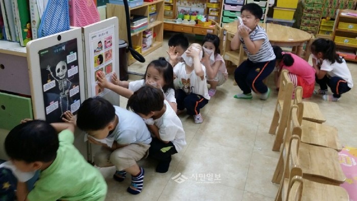 최근 경기 부천시 복사초등학교 병설유치원은 유치원 교직원과 원생 전체를 대상으로 화재발생 실제 상황을 가정해 소방안전교육 및 화재대피훈련을 실시했다. 사진은 화재경보가 울린 후 담임선생님의 지도하에 손수건으로 입과 코를 막고 대피하고 있는 원생들의 모습. (사진제공=부천교육지원청)