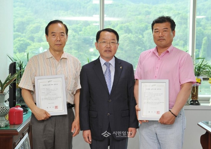 지난 5월30일 경기 광주시는 경제산업국장실에서 이광균 경제산업국장이 참여한 가운데 신규로 공동브랜드 '자연채' 사용 승인을 받은 '지마크연합사업단'과 '콩마을' 대표자들에게 '자연채' 상표사용 승인서를 교부했다. 사진은 승인서 교부 후 기념촬영을 하는 모습. (사진제공=광주시청)