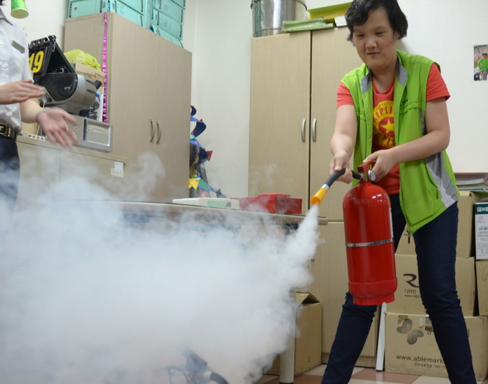지난 2일 서울 영등포구 영등포 소방서가 당산동에 위치한 리드릭을 방문해 중증장애인 생산품시설 관계자 및 종사자 20여명을 대상으로 초기 대응요령을 비롯한 화재안전교육을 실시했다. 사진은 이날 교육 중 소화기를 이용한 '가상 화재진압 교육'을 하는 모습. (사진제공=영등포소방서)