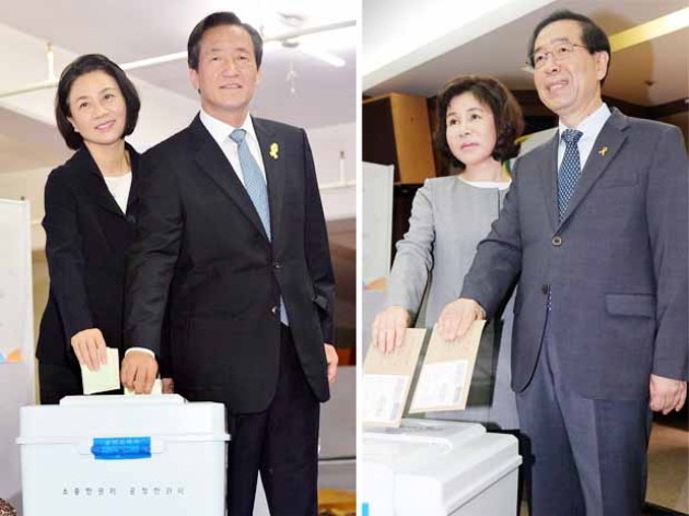 정몽준 새누리당 서울시장 후보가 부인 김영명씨와 함께 6.4지방선거 투표날인 4일 오전 서울 동작구 삼성래미안 아파트 제6 투표소를 찾아 투표를 하고 있다. 새정치민주연합 박원순 서울시장 후보는 제6회 전국동시지방선거의 사전투표가 시행된 30일 서울 구로구 구로 3동 주민센터에서 강난희씨와 함께 투표를 마쳤다.
