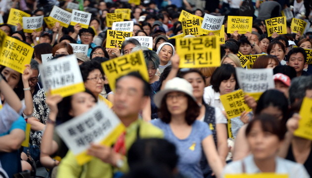 7일 오후 서울 종로구 서린동 청계광장에서 열린 '세월호 추모 범국민 촛불행동'에서 참가자들이 피켓을 들고 있다.