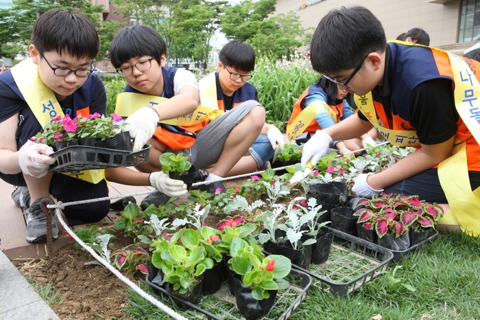 지난 5일 서울 성동구 한양사대부중과 성원중 학생 봉사단 50여명의 학생들이 각각 왕십리 광장과 서울숲 공원 앞 무명지 연못 주변에 임파첸스, 코리우스 등 4종 4200본의 계절 꽃묘를 심었다. 사진은 꽃묘 심기 활동 중인 한양사대부중 1학년 샤프론 봉사단 학생들의 모습. (사진제공=성동구청)