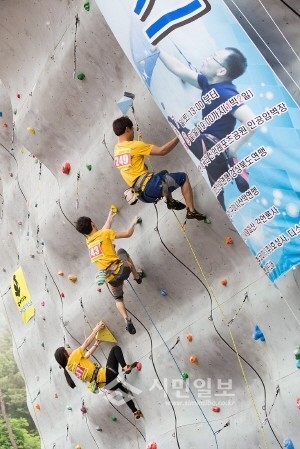 경북 구미시는 지난 8일 전국 스포츠클라이머 500여명이 참가한 가운데 해평면 송곡리에 위치한 '구미 산악레포츠공원 인공암벽장'에서 이틀간 열린 '2014 YesGumi 전국 스포츠클라이밍대회'를 성료했다. 사진은 대회에 참가한 참가자들의 경기 모습. (사진제공=구미시청)