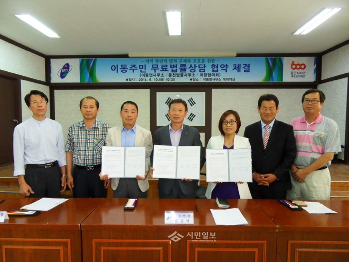 경기 용인시 처인구 이동면은 10일 지역주민들의 법무 상담 불편해소를 위해 김종억 이동면장과 김용숙 동천법률사무소 소장, 조동식 이동면이장협의회장 및 관계자들이 참여한 가운데 무료 법률상담 협약을 맺었다. 사진은 이날 협약식에 참여한 관계자들의 모습. (사진제공=용인시청)