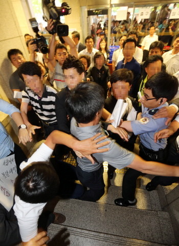 세월호 참사 승무원에 대한 첫 재판이 10일 오후 광주 동구 광주지방법원에서 열릴 예정인 가운데 희생자 가족들이 피켓을 들고 재판정에 입장하려다 이를 제지하는 법원 직원들과 마찰을 빚고 있다.