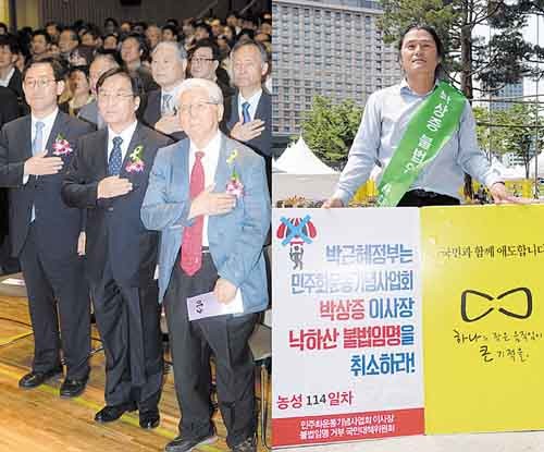 10일 오전 서울 중구 서울시청 다목적홀에서 열린 정부 주최 ‘제27주년 6.10 민주항쟁 기념식’에서 강병규 안전행정부 장관, 박상증 민주화운동기념사업회 이사장을 비롯한 참석자들이 국민의례를 하고 있다(왼쪽). 한편 민주화운동기념사업회 이사장 불법임명거부 국민대책위 등은 박 이사장 낙하산 인사에 반대하는 의미에서 민간 주최 6.10 기념식을 열었다.