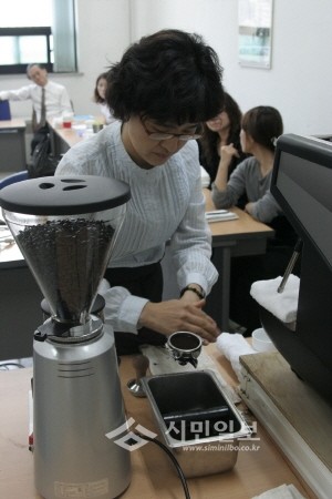 | ▲ 강서구가 그리스도대학교와 함께 운영 중인 '강서새로미대학' 참여자가 바리스타 자격증 취득을 위한 강좌에서 커피를 내리는 연습을 하고 있다.(사진제공=강서구청) | ||