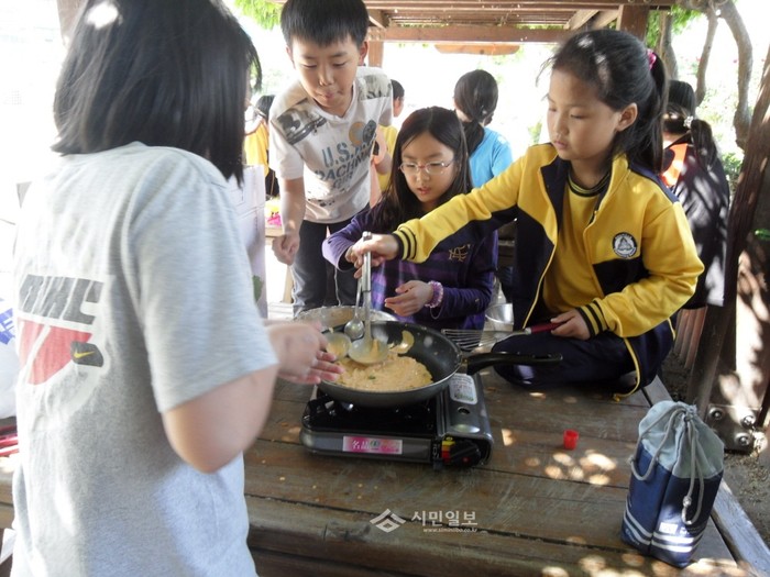 | ▲ 지난 5월 실시한 홀몸노인 방문 전 노인들을 위해 김치전을 부치고 있는 금북초 봉사동아리 아이들. (사진제공=성북구청) | ||