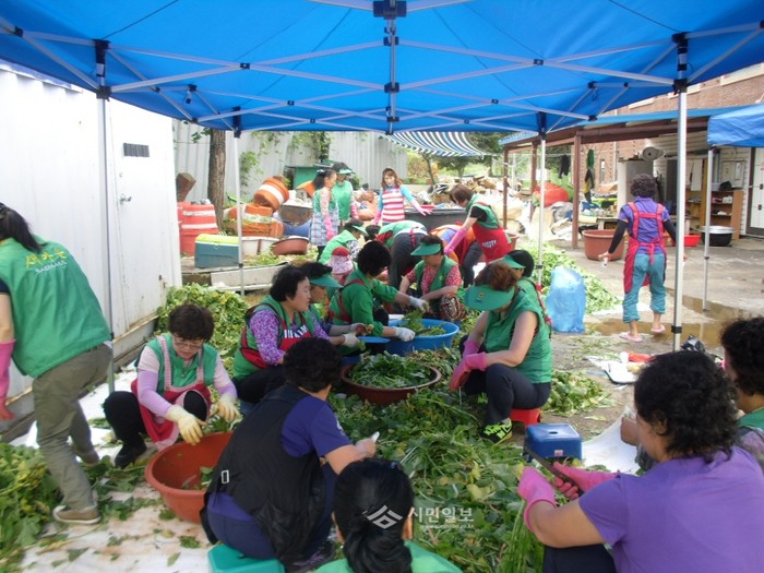 경기 화성시 남양동 새마을부녀회는 11일 부녀회원과 자원봉사자 등 30여명이 참여한 가운데 지난 5월부터 직접 재배한 열무로 김치를 담가 남양동 지역내 홀몸노인 105가구에 전달했다. 사진은 열무김치를 담그고 있는 행사 참가자들의 모습. (사진제공=화성시청)