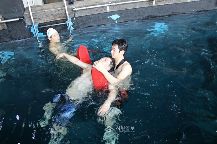 경기 포천소방서는 최근 영중면 금주리 금주 저수지에서 '영중 119 안전센터' 남녀 의용소방대원 54명이 참여한 가운데 수난구조교육훈련을 실시했다. 사진은 구명환 등 기구를 이용해 인명구조기법을 배우고 있는 의용소방대원들의 모습. (사진제공=군포소방서)
