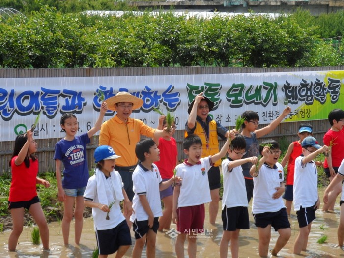 서울 도봉구는 농촌체험 활동을 통해 도시의 어린이들이 우리 농업의 소중함을 깨우치도록 지난 11일 도봉동 친환경 영농체험장에서 전통모내기 체험행사를 실시했다. 이날 행사에는 월천초등학교와 동북초등학교 어린이 및 학부모 120명이 참여해 300㎡의 논에 모를 심었다. 사진은 논에 모내기를 하는 참가자들의 모습. (사진제공=도봉구청)