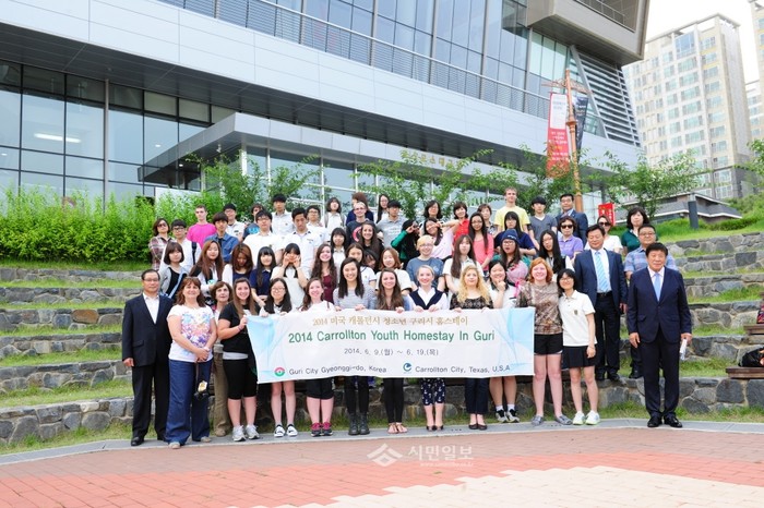 지난 9일 경기 구리시와 자매결연을 한 미국 캐롤턴시의 '청소년 교류 방문단'은 '구리시 청소년 가정에서의 홈스테이 및 한국문화 체험'을 위해 구리시를 방문했다. 사진은 환영식 후 구리아트홀 앞에서 기념촬영 중인 캐롤턴시 방문단과 구리시 학생들의 모습. (사진제공=구리시청)