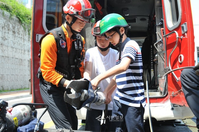 서울 은평소방서는 지난 11일 안전체험교실 및 뒤뜰에서 상신중학교 학생 및 지도교사 15명이 참가한 가운데 '소방관 직업체험교실'을 운영했다. 이날 체험교실에서 아이들은 시청각 교육을 비롯해 구조장비 숙달 훈련 및 공기식 에어백 조작을 체험했다. (사진제공=은평소방서)