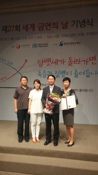 경기 구리시는 지난 12일 한국프레스센터에서 개최된 '제27회 세계금연의 날' 행사에서 효과적 흡연 예방교육과 체계적 흡연 규제사업 추진 등 적극적 금연활동을 인정받아 금연사업 유공 우수기관으로 선정돼 보건복지부장관상을 수상했다. 사진은 이날 보건복지부장관상을 수상한 구리시 관계자들의 모습. (사진제공=구리시청)