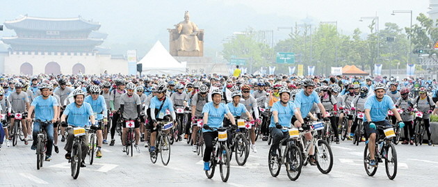 15일 오전 서울 종로구 광화문 광장에서 2014 하이서울 자전거대행진에 참가한 박원순(가운데) 서울시장과 시민들이 월드컵공원 평화광장을 향해 힘찬 출발을 하고 있다. 올해로 6회째를 맞이하는 자전거 대행진은 광화문 광장을 출발해 서울역, 한강대교 북단을 지나 강변북로를 통해 월드컵공원 평화광장에 도착하는 총 21km의 코스로 운영되며, ‘친환경 교통문화확산’이라는 주제 아래 시민참여형 행사로 진행된다.