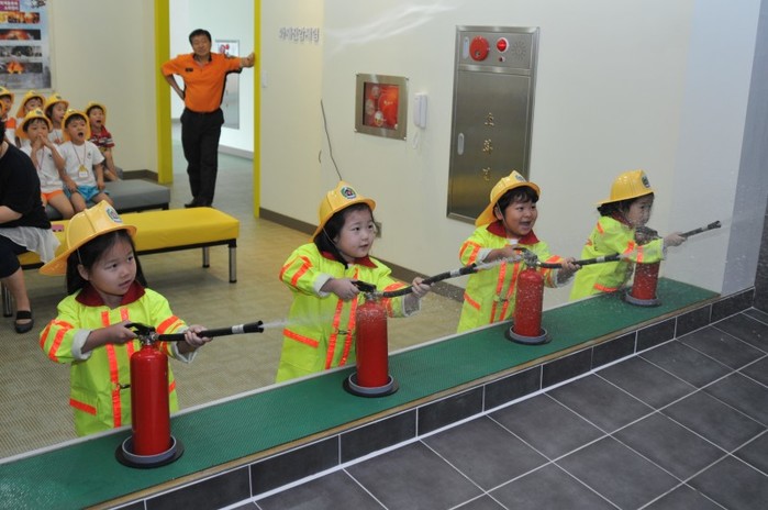 서울 은평소방서는 지난 13일 소방서 안전체험교실에서 원생 및 지도교사 30여명이 참석한 가운데 소방안전교육을 실시했다. 사진은 소화기 시뮬레이션 화재진압체험 코너에서 교육용 물소화기를 이용한 표적 맞추기 화재진압 훈련을 실시하는 아이들의 모습. (사진제공=은평소방서)