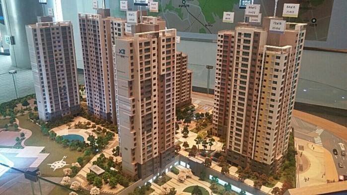 | ▲도심 컨셉의 색채 디자인 매뉴얼이 적용된 상도파크자이 외관 모형. (GS건설 제공) | ||