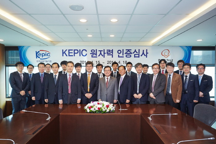 | ▲ 한화건설 이근포 사장(사진 앞줄 왼쪽에서 여섯번째)외 임직원과 KEPIC 인증심사단이 장교동 한화빌딩 12층 회의실에서 KEPIC 원자력 인증심사를 마치고 기념사진을 촬영하고 있다. | ||