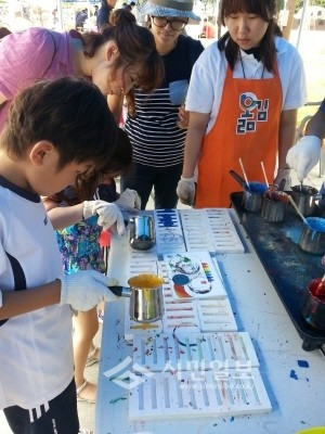지난 21일 서울 강북구 꿈의 숲 광장에서 열린 '꿈의 장터'가 5000여명이 참석한 가운데 성공리에 막을 내렸다. '꿈의 장터'는 자원절약과 주민화합을 위해 강북구가 올해 처음 개최한 대규모 녹색장터로, 주민들이 가정에서 사용하지 않는 중고물품을 직접 전시하고 판매·교환할 수 있는 주민 참여형 공간이다. 사진은 재활용 크레파스를 만들고 있는 아이들의 모습. (사진제공=강북구청)