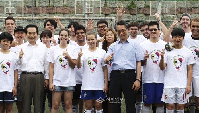 지난 22일 서울 종로구는 대신고등학교에서 한국에서 공부하고 있는 유학생 20명과 한국 청소년 20명, 대신중학교 축구부 51명 등 100여명의 학생과 함께 '브라질 월드컵 기념 한국-브라질 학생 친선 축구 경기'를 열었다. 사진은 이날 경기에 앞서 김영종 종로구청장(오른쪽에서 네번째)이 경기 시축 전에 브라질 유학생들과 파이팅을 외치고 있는 모습. (사진제공=종로구청)
