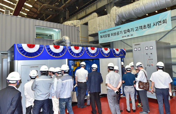 | ▲ 현대중공업이 26일(목) 울산 본사에서 독자 개발한 '터보 공기압축기'에 대한 시연회를 열었다. 시연회에 참석한 고객들이 현대중공업의 공기압축기를 둘러보고 있다. | ||