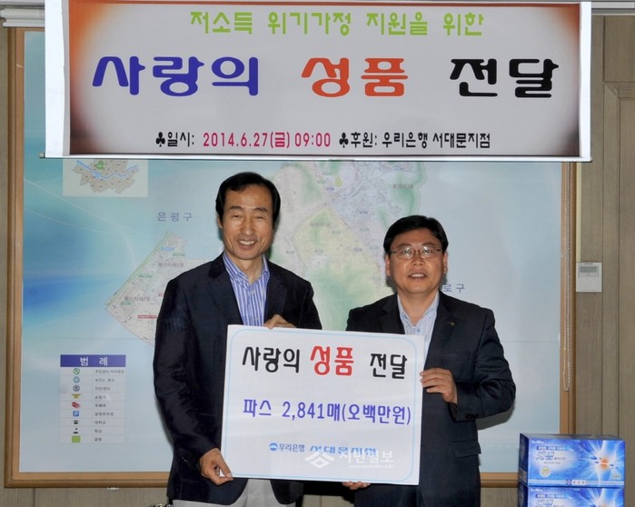 지난 27일 서울 서대문구는 구청 회의실에서 'I WISH 따뜻한 서대문' 17호 협약 기관인 우리은행 서대문영업본부로부터 저소득 이웃을 위해 써달라며 파스 2800여세트를 사랑의 성품으로 전달받았다. 사진은 박영진 우리은행 서대문구청 지점장(우)과 문석진 구청장(좌)의 모습 (사진제공=서대문구청)