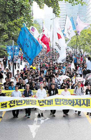 전국민주노동조합총연맹 회원들이 28일 오후 서울 청계광장에서 민주노총 총궐기대회 및 2차 시국대회를 연 뒤 쌀 개방 반대, 노동기본권 쟁취 등을 외치며 행진하고 있다.