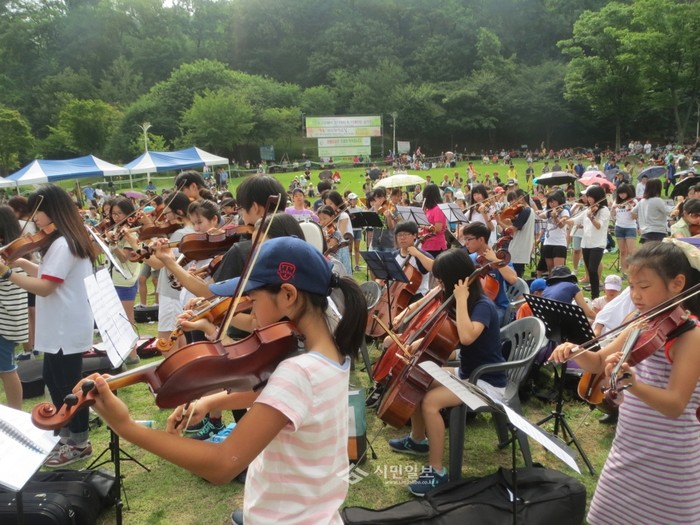 지난 28일 서울 강동구에서 주민 1000여명이 일지산 잔디광장에 모여 바이올린, 통기타, 오카리나, 색소폰 등 다양한 악기로 즉석 연주를 하는 플래시몹 음악회가 개최됐다. 사진은 광장에서 다양한 악기를 연주하고 있는 주민들의 모습.(사진제공= 강동구청)