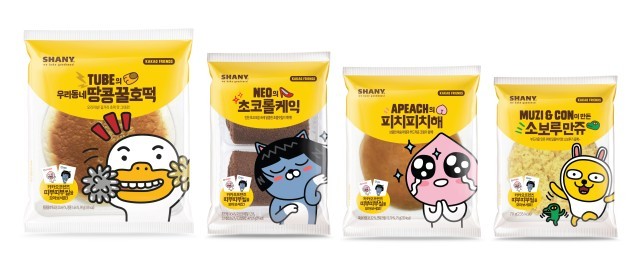 카카오프렌즈 빵은 카카오톡의 대표 이모티콘 캐릭터인 어피치와 무지를 비롯한 다양한 캐릭터를 사용한 제품들로 '튜브의 우리동네 땅콩 꿀호떡', '네오의 초코롤케익', '어피치의 피치피치해', '무지&콘이 만든 소보루만쥬' 등 총 4종이 출시되었으며 가까운 슈퍼에서 구매할 수 있다.