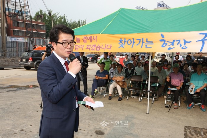 서울 성동구는 지난 1일 '분당선 서울숲역 앞 아파트형공장 공사현장'을 방문해 정원오 구청장을 비롯해 주민 50여명이 함께한 가운데 민선6기 성동구의 첫 '현장구청장실'을 진행했다. 사진은 이날 공사현장을 방문한 정 구청장의 모습. (사진제공=성동구청)
