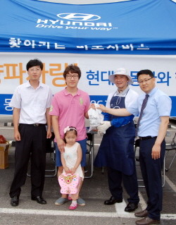 현대자동차 임시 서비스센터에서 6일 한 고객이 차량 무상점검을 받은 뒤 현장에서 양파를 선물로 받고 있다.