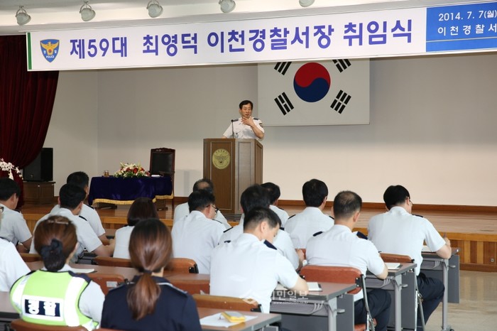 경기 이천경찰서는 7일 4층 대강당에서 직원들이 참석한 가운데 '제59대 최영덕 이천경찰서장 취임식'을 개최했다. 이날 최 서장은 취임사에서 협력 치안 인프라 구축 등을 통해 안전하고 살기 좋은 이천을 만들어 나가자고 말했다. (사진제공=이천경찰서)