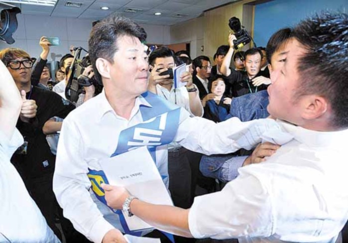 | ▲ 새정치민주연합 7.30 재보선 서울 동작을 지역에 전략공천된 기동민(오른쪽 두번째)전 서울시 정무부시장이 8일 오전 서울 여의도 국회 정론관에서 당 지도부의 전략공천을 수락하는 기자회견을 하고있는 가운데 전략공천에 항의하는 허동준 전 지역위원장과 관계자들이 항의하고 있다. /뉴시스 | ||