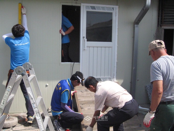 경기 여주시 중앙동은 지난 4일 지역내 자원봉사자 및 공무원 등이 참여한 가운데 장애인이 거주하는 주택을 방문해 휠체어 출입이 가능하도록 경사로를 설치하는 등 '맞춤형 집수리 사업'을 실시했다. 사진은 이날 집수리 사업에 참가한 자원봉사자들의 모습. (사진제공=여주시청)