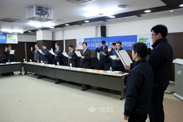 | ▲ K-water 수도권지역본부가 방만경영을 개선하고 기후변화로 더 어려워지는 물 관리 여건을 극복하기 위해 연 비상경영전략회의에서 참여자들이 선서를 하고 있다.(사진제공=K-water제공) | ||