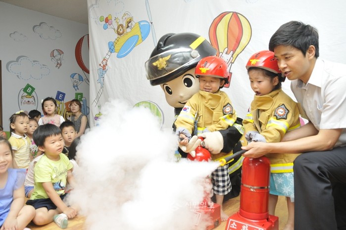 10일 서울 구로 소방서가 금천구청 지하 1층 영·유아플라자 시흥점 체험학습실에서 어린이 및 보육교사 등을 대상으로 '소방관이 찾아가는 소방안전 체험교육'을 실시했다. 사진은 참여 아동들이 소방관 복장을 입고 화재진화 체험을 하고 있는 모습.(사진제공=구로소방서)