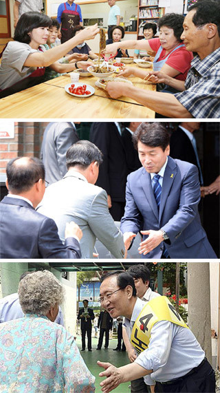 7.30 재보선 서울 동작을에 출마한 새누리당 나경원 후보가 12일 서울 동작구 사당동 본향교회에서 열린 ‘어르신 짜장면데이’ 행사에서 배식봉사 후 어르신들과 함께 짜장면을 먹고 있다(맨 위). 기동민 새정치민주연합 후보(오른쪽)가 13일 오전 서울 동작구 한 교회를 찾아 교인들과 인사를 나누고 있다(가운데). 정의당 노회찬 후보도 13일 오전 서울 동작구 사당동 성진교회를 찾아 주민들에게 지지를 호소하고 있다.