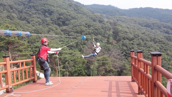 최근 경기 용인시가 용인자연휴양림 지주대 사이에 와이어를 걸고 트롤리를 통해 빠른 속도로 반대편으로 이동하는 체험형 산림레포츠시설인 '용인 짚라인' 설치공사를 마쳤다. '용인 짚라인'은 오는 8월부터 운영을 시작할 예정이다. 사진은 완공된 짚라인을 시범이용 중인 모습. (사진제공=용인시청)