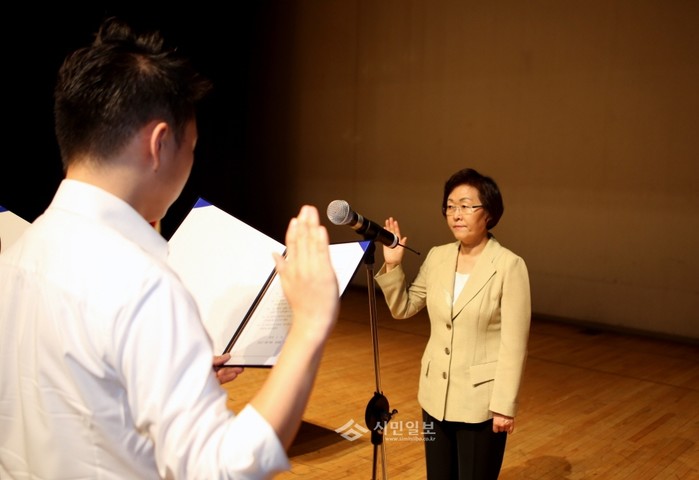 지난 14일 서울 강남구는 강남구민회관에서 ‘강남구 공직자 청렴 결의 대회’를 열고 전직원의 부조리를 근절하고 법와 원칙을 준수하는 바른 공직 풍토 조성을 위한 청렴 결의를 실시했다. 사진은 신연희 강남구청장이 청렴 실천을 결의하는 직원대표의 선서를 받고 있는 모습. (사진제공=강남구청)