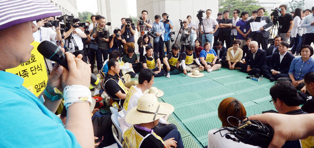 16일 오전 새정치민주연합 김한길, 안철수 공동대표와 박영선 원내대표가 서울 여의도 국회 본관 앞에서 세월호특별법 제정을 촉구하며 농성중인 세월호가족 대책위와 간담회를 하고 있다.
