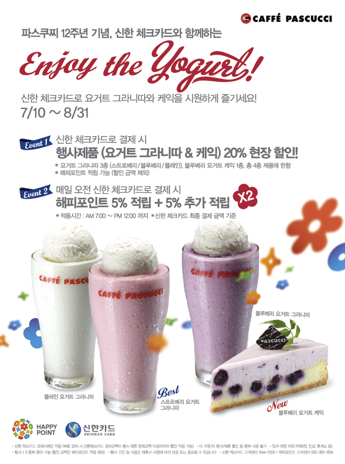 파스쿠찌는 오는 8월31일까지 신한체크카드로 결제할 경우 요거트 그라니따 3종과 요거트 케이크를 20% 할인해 판매한다. 해피포인트 적립도 동시에 받을 수 있다. 이 기간 중 오전 7시~낮 12시 사이에 신한체크카드로 결제할 경우에는 모든 제품에서 해피포인트를 2배로 적립받을 수 있다.