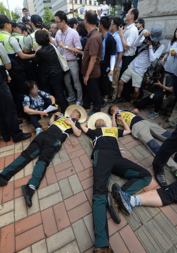16일 오후 세월호 참사 진실 규명 등을 요구하며 지난 15일부터 도보 행진한 안산 단원고 2학년 학생들이 국회에 도착한 가운데 일부 행진 참가자들이 국회에 진입하다 경찰에 저지를 받자 인도에 누워 있다.
