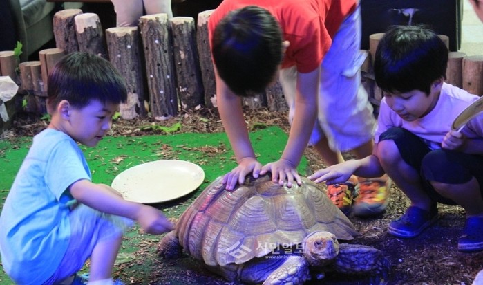 | ▲ 신당역 지하에 위치한 ‘곤충파충류생태체험학교’에서는 다양한 살아있는 생물을 체험해볼 수 있다. 사진은 '파충류관'에서 큰 거북이를 만져보고 있는 아이들. | ||