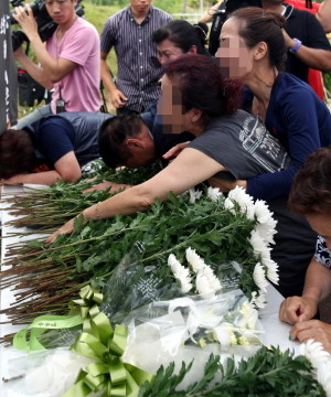18일 오전 광주 광산구 장덕동 수완지구 한 아파트 앞에 마련된 헬기 추락사고 합동분향소에서 유가족이 오열하고 있다.
